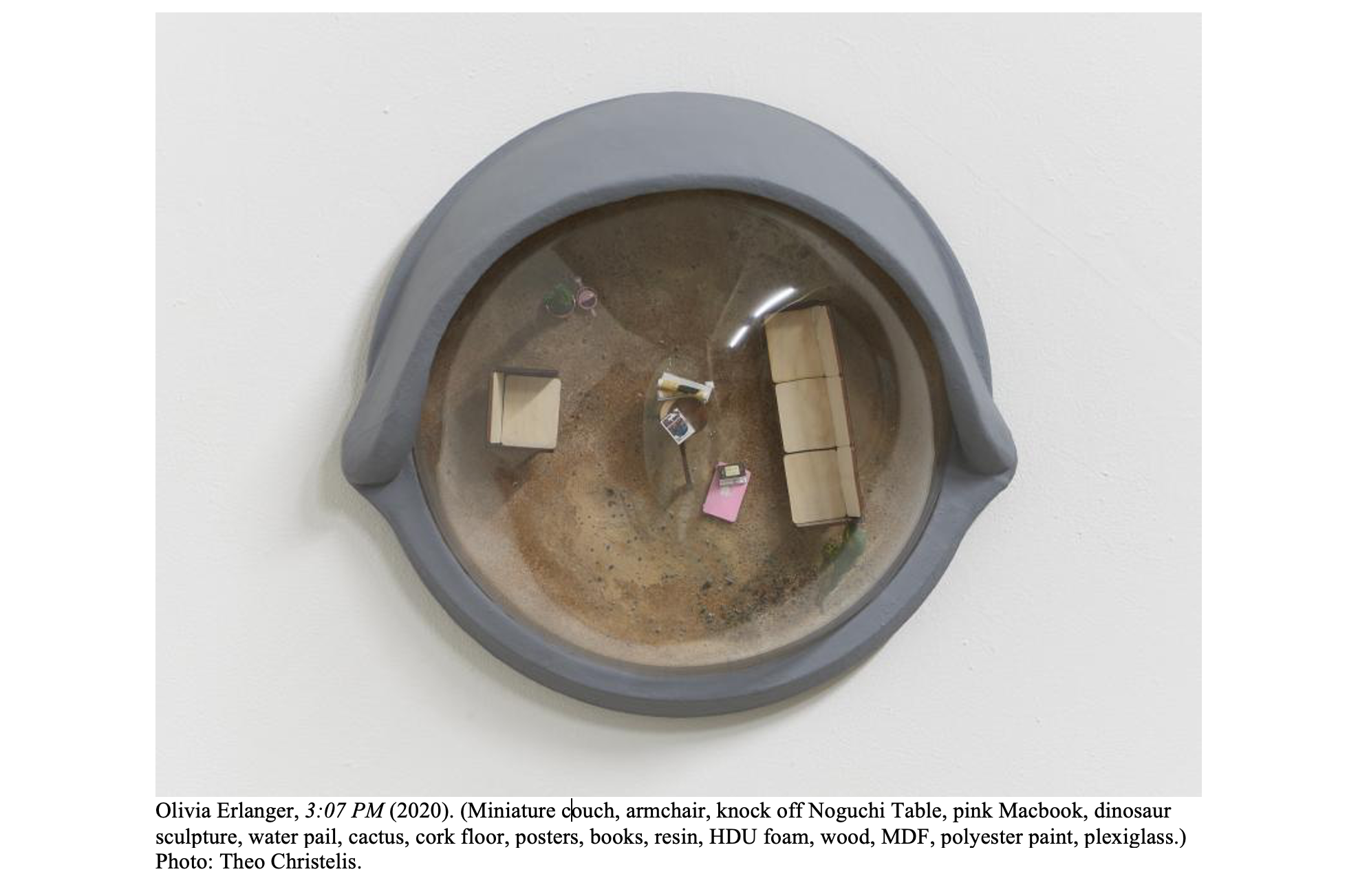 During the COVID-19 lockdown in 2020, the New York based artist Olivia Erlanger began a series of artworks that would later form the exhibition Home is a Body.[1] Moving around her small apartment, she became interested in the “ghost of [her own] presence,” how a body “imprints” a room, and what the “use value of a room is when empty.”[2] She conceptualised these eye-shaped globes of apartment interiors, each titled at different times of the day, as “reverse apartment peepholes.” The “absence of action” was important to her, without any figural representation – but, as the title’s maxim intuits, not without a body.